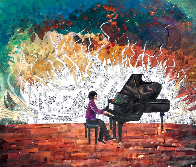 Thoughts: Leslie Elaine says: I wanted to express the energy or frequency of music and how it powerfully impacts the soul, so the music paper is in sine-curve-like cuts to represent the sound waves. Details to notice: words I cut from a dictionary, a butterfly on the left!