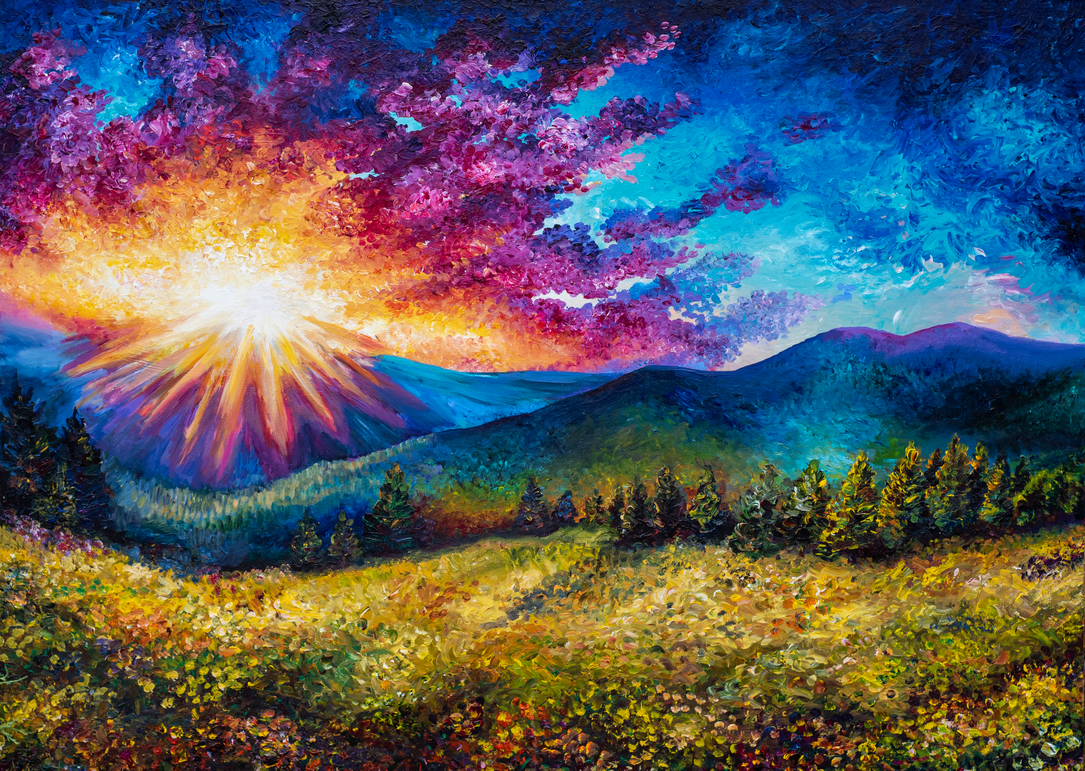 Art: artist's favorites clouds featured impressionistic light rays meadow mountains natural sky(big sky) sun sunset texture tree