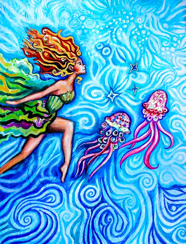 Art: cool/blue cute dress/gown featured girl/woman hair jellyfish ocean swirly water