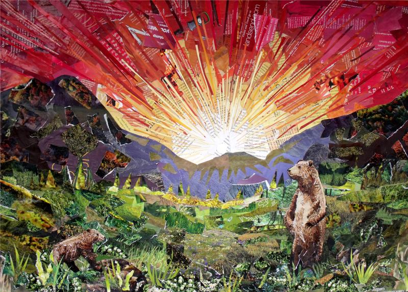 Thoughts:   This is Leslie's largest collage, made special for her Uncle Tom. He wanted bears and mountains and big. Leslie surprised him on Easter Sunday 2011 with this.