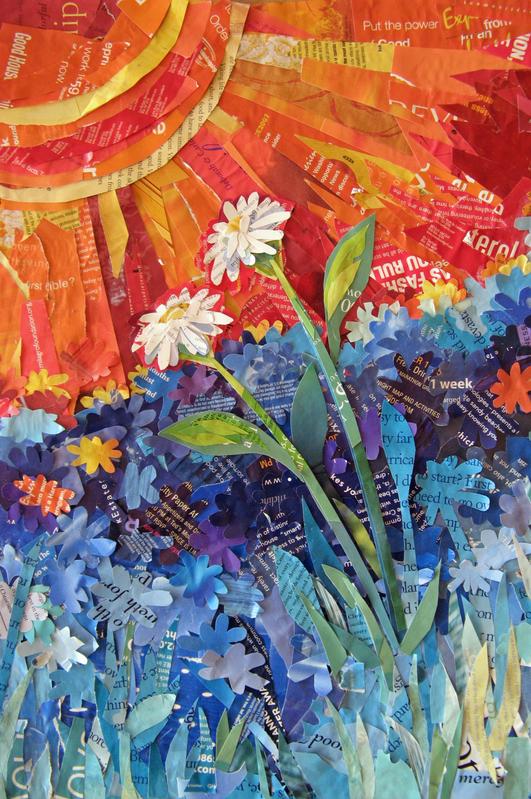 Thoughts:   Leslie Elaine says: this is one of my favorite pieces and my best selling print! I made it for my dear friend Doreen. I knew she loves daisies and my collages so that is how it began. First I got out my nature calendars and magazines. I did the sunrays first, then the sun. For the lower background I did a base of blue and then cut out flowers to make it like a field of daisies. I finished with the two daisies in the middle and the lighter daisies in the foreground. I made sure to do some daisies in warm colors - red, orange and yellow - so it looks like some daisies reflect the sun and also to unify the piece. Daisies are so hopeful!