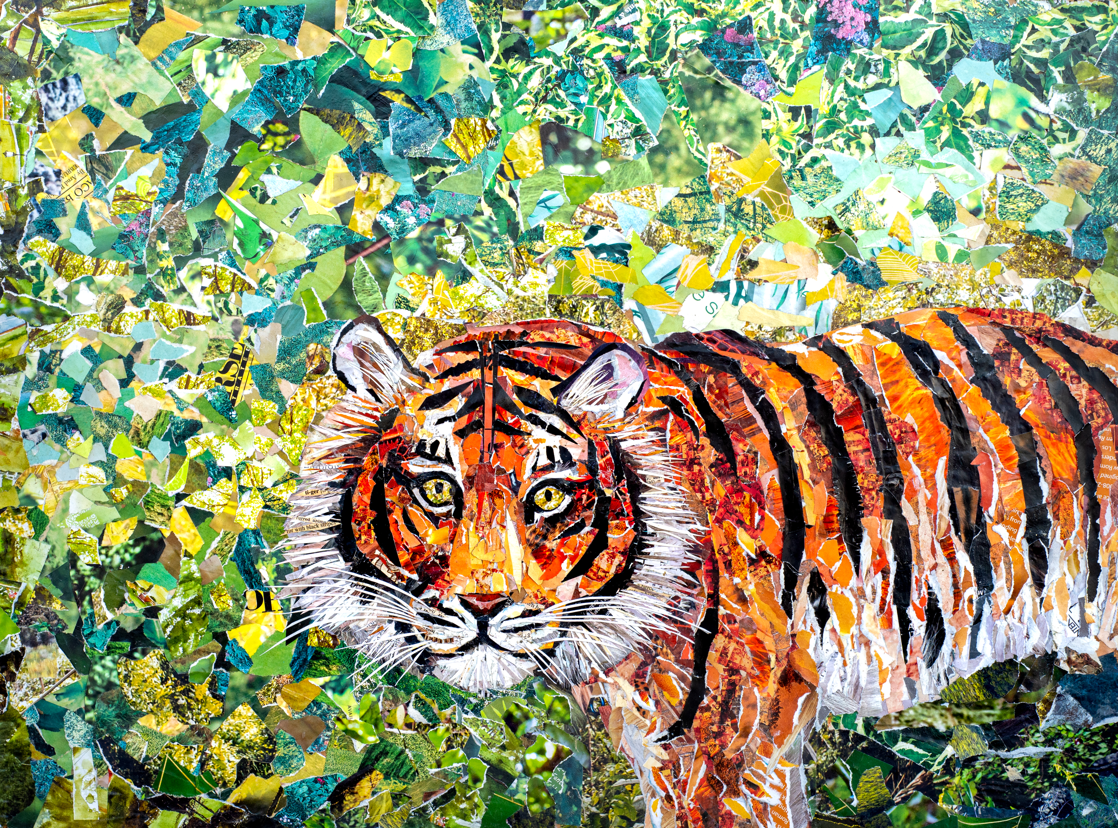 Thoughts: Leslie Elaine says: I felt like making a new collage and wanted to do something Evan would like. I thought to do a tiger. I worked on it slowly over the course of 2 years - starting with the green background and eventually finishing with the details and words in the face. I chose many colors from magazines and calendars - including calendar photos of red rocks in Utah that worked well for the tiger's fur. To do the fur around his face, I used white paper and even dictionary paper! Can you see the word tiger? and "fur with stripes" in the fur of the face? I cut card stock to do the whiskers! :) I started this tiger for Evan before he chose Clemson, so it was really cool when I realized I had made him his school mascot without knowing it! Go Tigers!