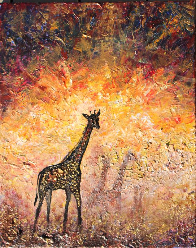 Thoughts:   Leslie Elaine says: This painting started with extra paint from the palette. I made ton's of texture into a sunset and added gold, then did giraffes.