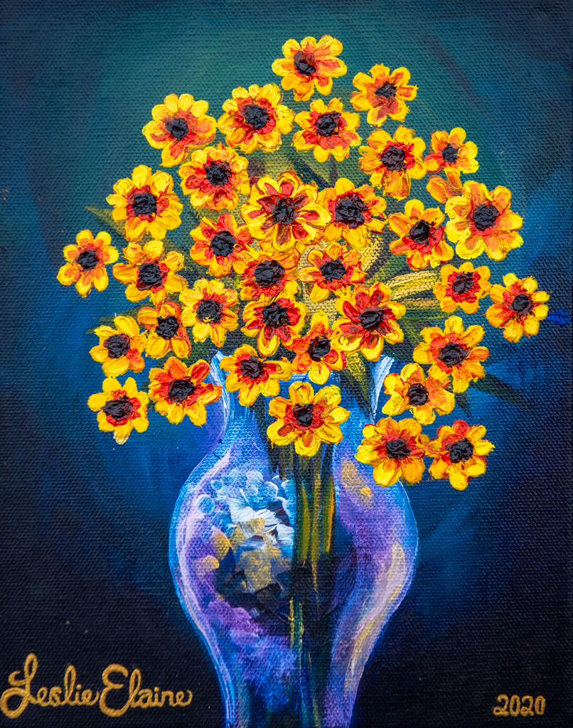 Thoughts: This painting is so special! It has rich texture in the flowers, and a really nice contrast between deep darker colors in the background, and beautiful bright colors that pop in the foreground! :)