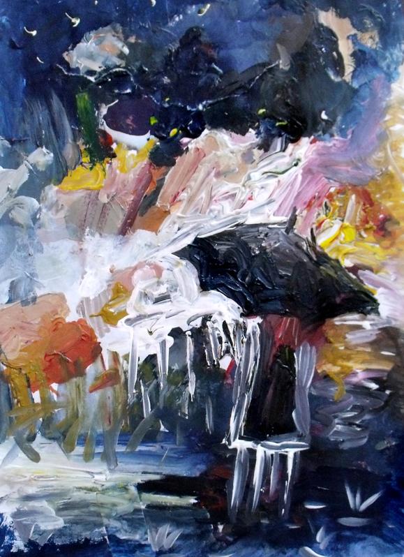 Thoughts: Leslie Elaine says: I had been using a piece of paper as my paint palette, and I had a significant puddle of paint left when I'd finished my project. I took my brush and moved the paint around. The black in the middle reminded me of an umbrella and the colors reminded me of lights, so I chose to make a person in a rainy city. I made vertical lines to look like rain out of the extra white. I defined the umbrella and the person, then added splatters of rain on the pavement. Mom says: Leslie made this "palette painting" in under 5 minutes. I so clearly see a woman with long red hair carrying the umbrella, but I realize you may see something entirely different.