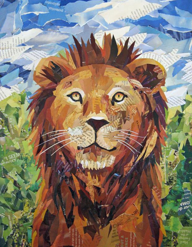 Thoughts: Leslie Elaine says: this lion was a surprise Christmas present for my mom in 2008. I worked on it at night and hid it in my closet. When Christmas came I wrapped it in our nicest wrapping paper. My mom opened it slowly in order to save the expensive paper, but when she saw the picture she was so excited that she forgot about carefully untaping the edges and ripped all the rest of the paper. Mom says: Stare into those eyes for a minute.... they are amazing - penetrating but compassionate. I was SO surprised by this collage because Leslie PLANNED it and HID it and FINISHED it. I just couldn't believe that each night she remembered to put it away where I wouldn't see it; I wander into her room a lot! I was also surprised by all the details that prove her patience. Examine the whiskers and all the pieces that make up the mane and face. Wow! And at 15 years old!