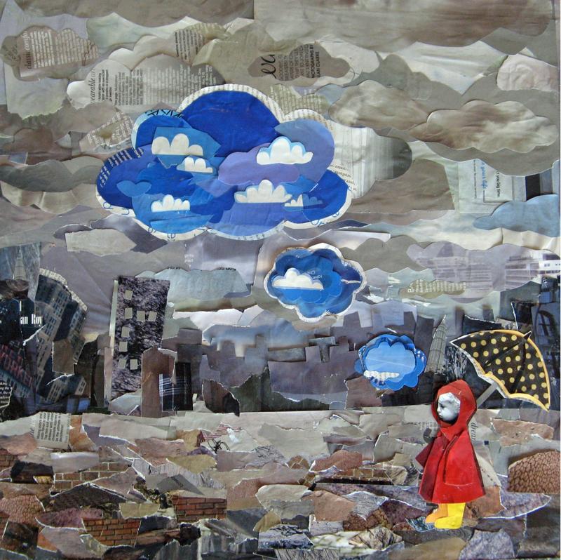 Thoughts: Leslie Elaine says: I think this was my first collage with a person in it; it is one of Dad's favorites. It's about trying to have hope and look on the bright side during rainy, gray, or hard situations. For me, at the time, that situation was health problems, depression and anxiety.